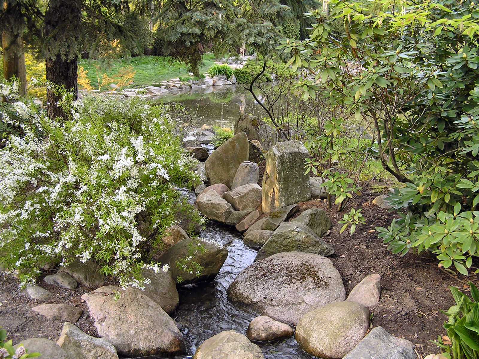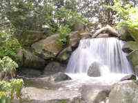 Z północnej strony ogrodu, wypływa ze wzniesienia struga wody, wpadająca do stawu symbolizującego morze. Jest to kaskada żeńska - ONNA-DAKI: spokojna, opanowana, łagodna. Z południowej zaś strony tryska wartki i gwałtowny strumień, który poprzez kamienną kaskadę męską - OTOKO-DAKI, trzema rwącymi potokami również dąży do symbolicznego morza.
