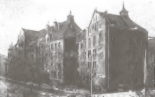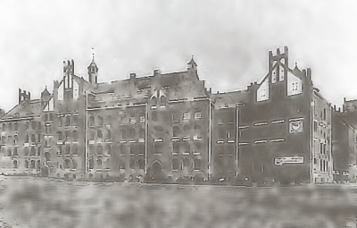 Budynek ten został zbudowany na kształt wydłużonego prostokąta przy elewacji bocznej i nakryty rożnej wysokości dachami. Ceglane elewacje udekorowano, a na elewacji frontowej zamiast zegara mechanicznego, umieszczono zegar słoneczny wykonany w technice sgraffita. Więźba dachowa wykonana z nitowanej stali umożliwiła przeszklenie dużej części dachu i umieszczenie sali gimnastycznej na poddaszu. Oba budynki zostały uszkodzone w czasie działań wojennych w 1945 roku (dach, szczyty, ceglane lico ścian). Po wojnie oba budynki użytkowane są jako szkoły.